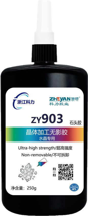 超高强度、不可拆卸。用于水晶/玻璃/金属/陶瓷/大理石/硅块等材料之间的粘结。此胶是本公司专门针对紫外线固化胶粘剂的缺陷所设计的,紫外线固化存在需要投资紫外光设备,材质需要一面透明,这就增加了设备投资成本,对材质通用性不强的缺陷。该胶属于底涂型第三代丙烯酸酯胶粘剂,也被称为晶体胶,粘接材料适应广,使用方便,气味低,无毒,粘接后不留痕迹(无影胶),固化速度快,粘接强度高,耐水煮性好,耐候性好等特点。